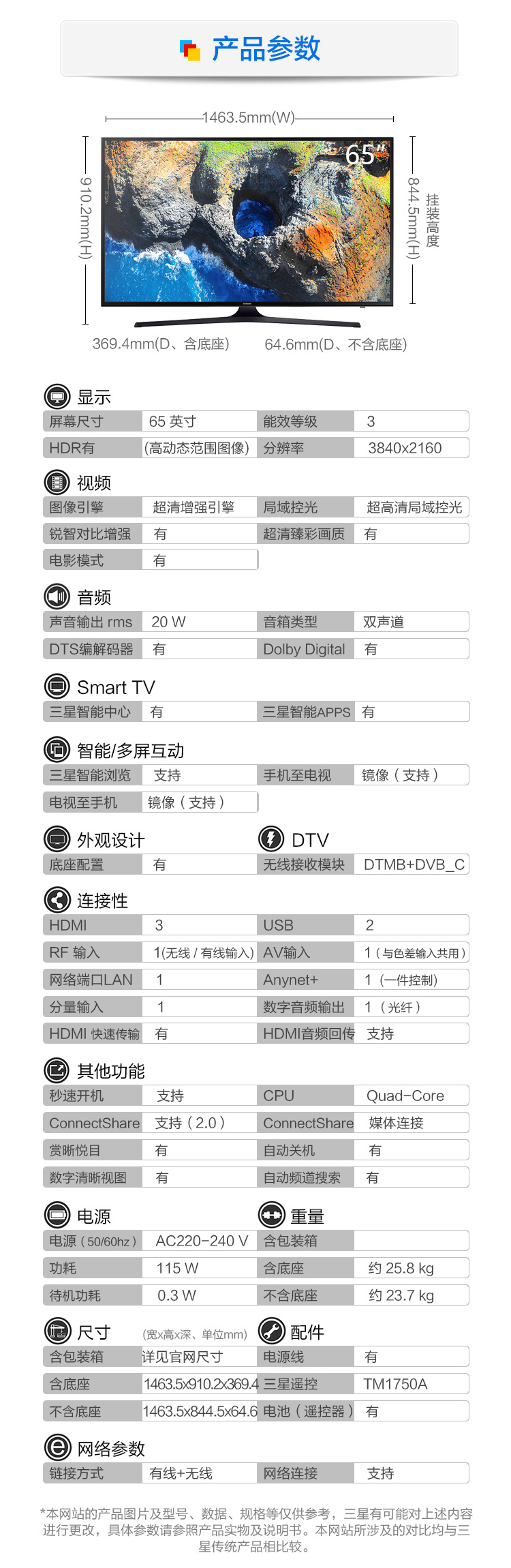 商品名称:三星(SAMSUNG) UA65MU6300JXXZ 65英寸 4K超高清 液晶平板电视