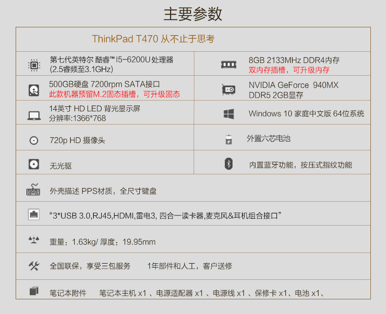 商品名称:ThinkPad T470(04CD)14英寸轻薄笔记本电脑(不包邮)