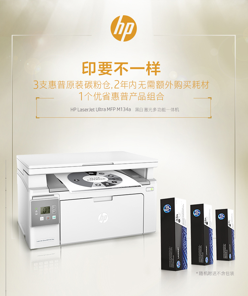 惠普(HP) M134fn激光打印机 多功能一体机(126a 升级型号,3支原装碳粉仓,打印、复印、扫描)