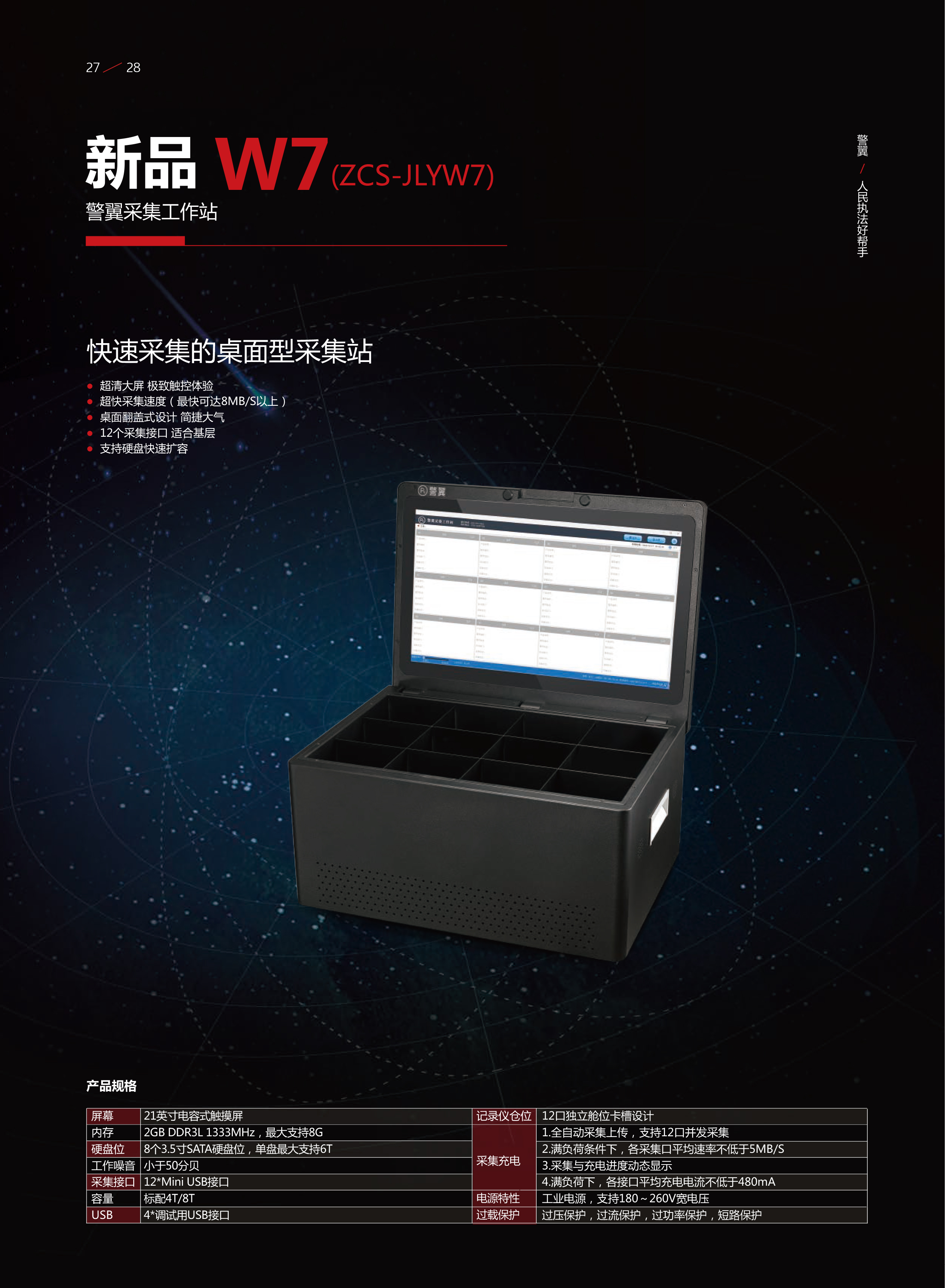 商品名称:警翼 新品W7 21.5寸超清触摸屏/高速采集/12采集口/桌面翻盖式设计 8T