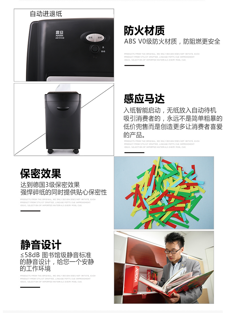 震旦AS1519CD黑霸王碎纸机:线条硬朗,磨砂外壳,采用热处理冷轧刀芯,机头部分采用防火安全规范的高等级阻燃材料,感应马达,静音设计