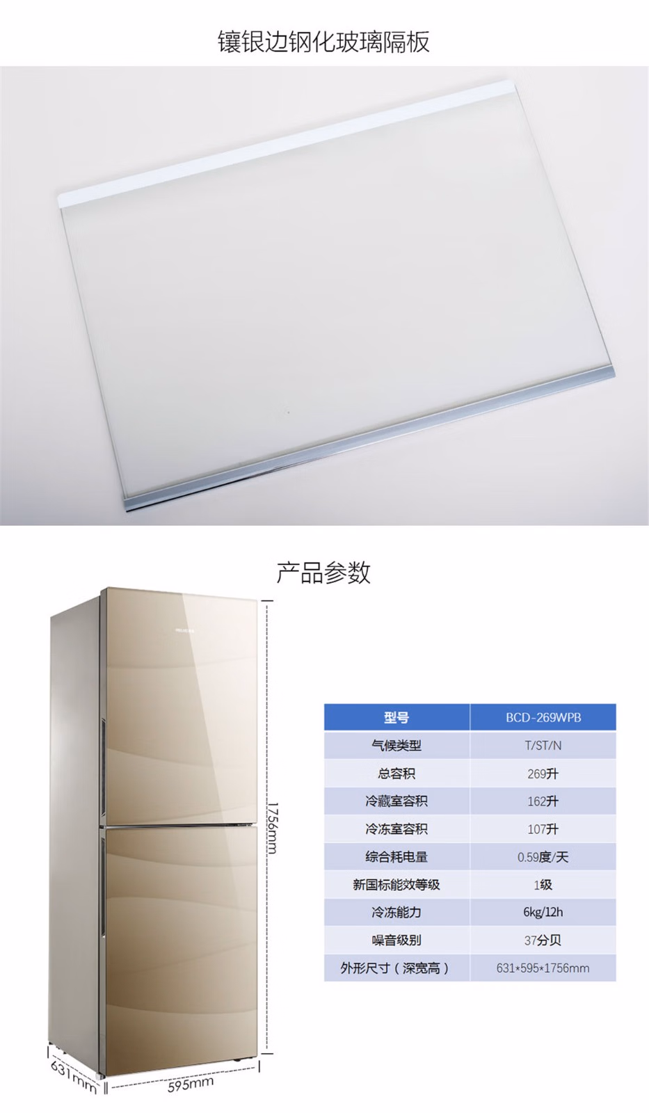 商品名称:美菱(MeiLing)269升双门BCD-269WPB 金色 (包安装)